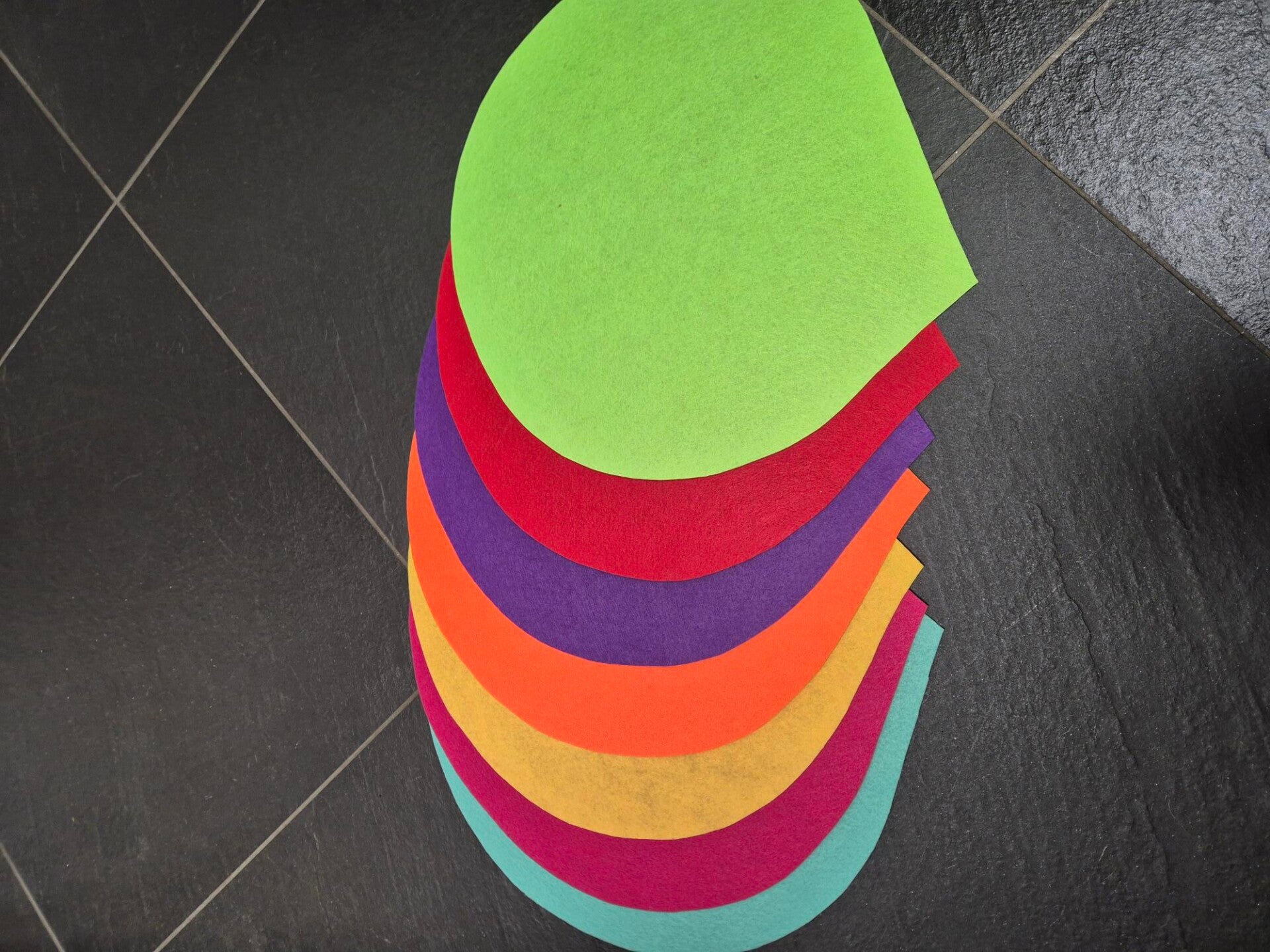Chakrakleuren, doorsnee maat is tussen de 43 en 45cm, dikte ongeveer 1 tot 2 mm, gemaakt van stevig vilt